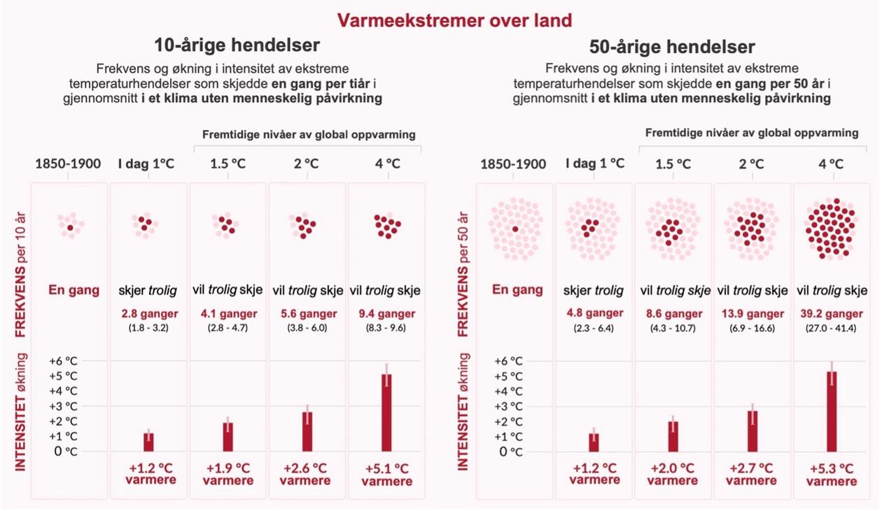 Figuren over viser hyppighet og intensitet av ekstreme temperaturhendelser som i gjennomsnitt forekom en gang per 10 år (lengst til venstre) og hvert 50. år (panel til høyre), i tiden før menneskelig påvirkning (1850-1900). Deretter vises hvordan hyppighet og intensitet endres i takt med økende global gjennomsnittstemperatur.