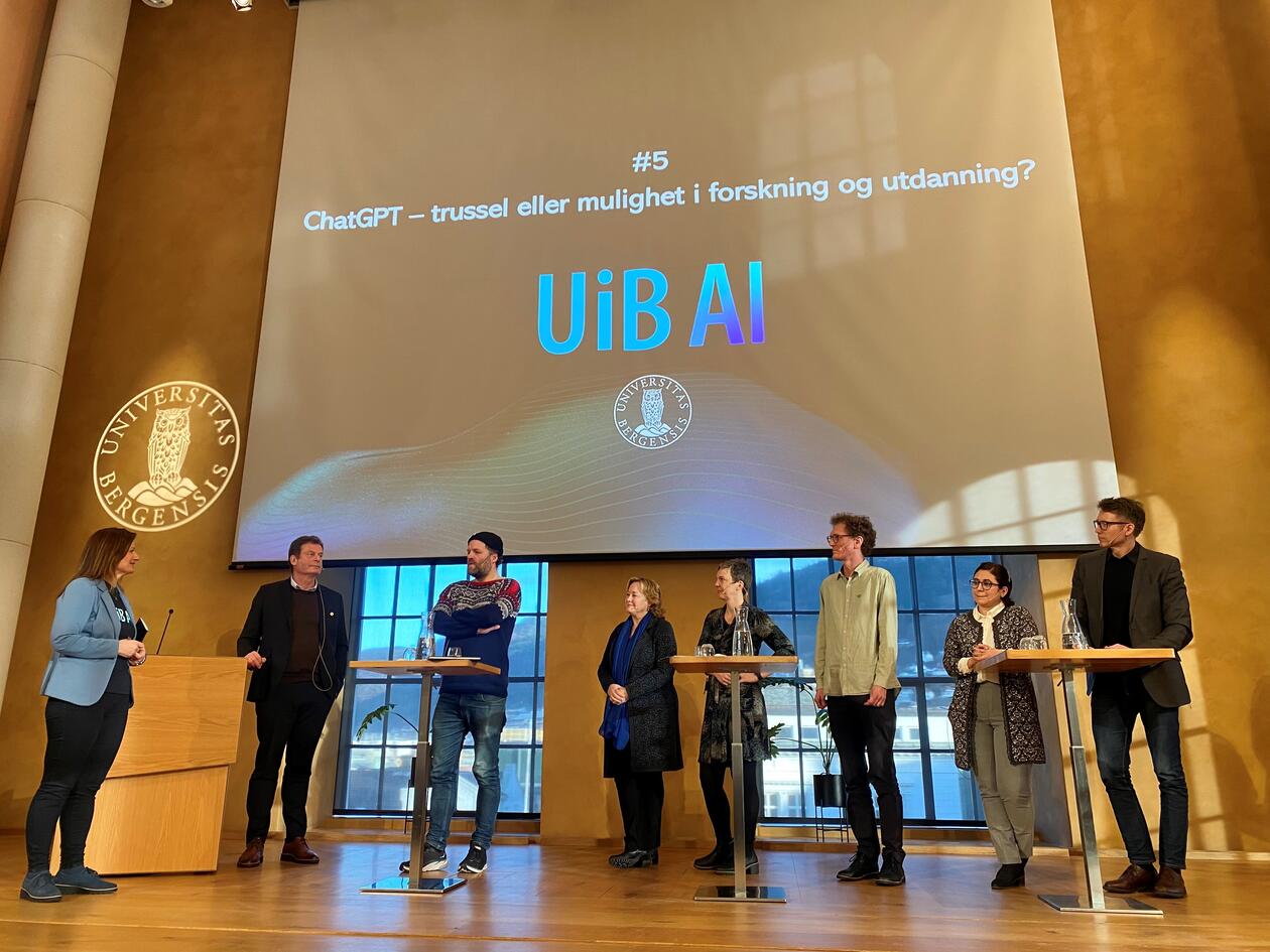 En fullsatt Universitetsaula i Bergen fikk med seg det femte UiB AI-seminaret den 3. februar 2023, som denne gangen tok for seg chatboten chatGPT og hvilken betytning utviklingen innen AI har for forskning og utdanning.