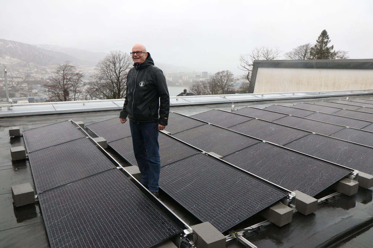 ENØK-ingeniør Steinar Sundberg ved Eiendomsavdelingen, UiB, er fornøyd når han ser ut over de 466 solcellepanelene på taket av Odontologibygget på Årstadvollen.