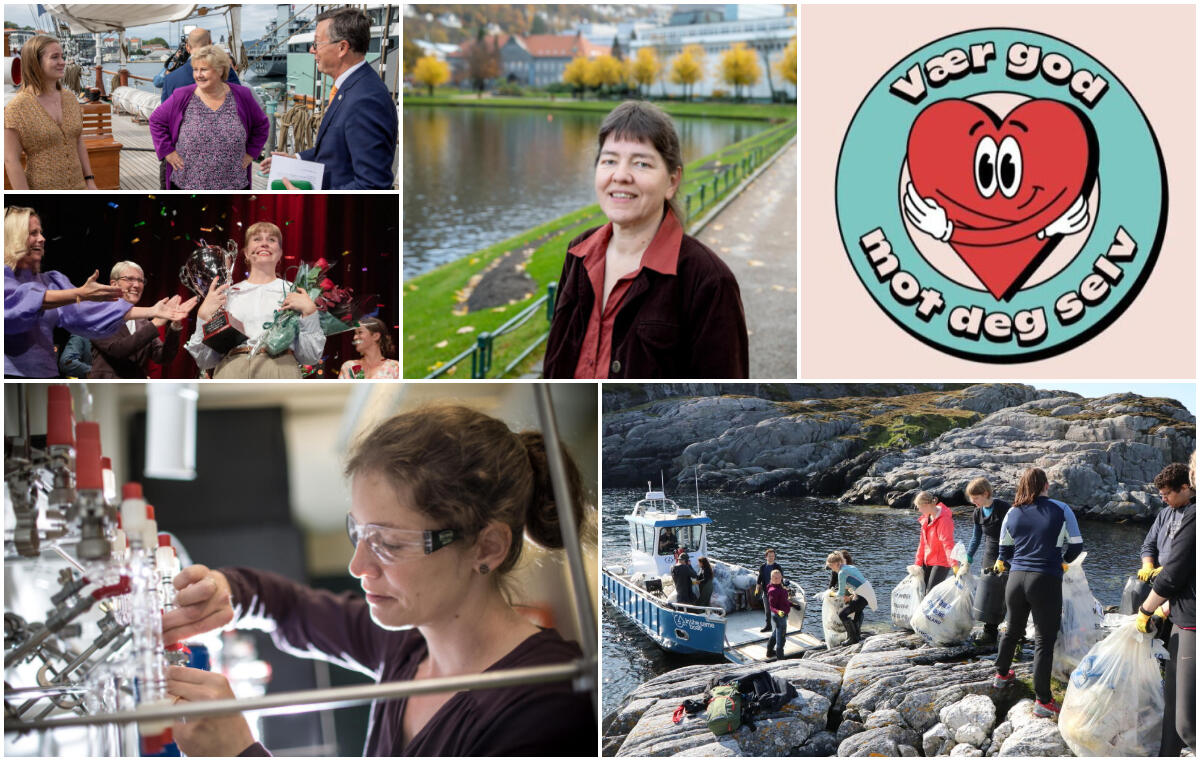Øverst f.v.: Student Thea Båtevik, statsminister Erna Solberg og rektor Dag Rune Olsen på lanseringa av One Ocean (Foto: Eivind Senneset), Musikkterapeut Tora Söderström Gaden vann Forsker Grand Prix (Foto: Yngve Vogt, Forskningsmagasinet Apollon, UiO), Andrea Bender mottok ERC Synergy Grant for prosjektet QUANTA (Foto: Eivind Senneset), UiB lanserte portalen Vær god mot seg selv, Nele Meckler var ein av fire forskarar som vart tildelt ERC Consolidator Grant (Foto: Eivind Senneseth), UiB og samarbeidspartnarar rydda fire tonn plast under årets store plastdugnad (Foto: Ole M. Kvamme).