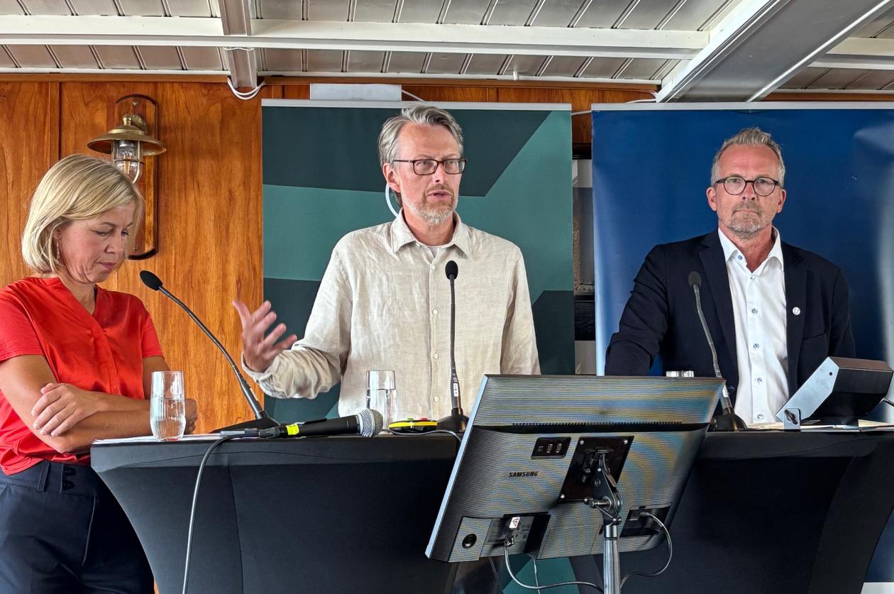 Rektor Margareth Hagen og forsknings- og høyere utdanningsminister Sigrun Aasland diskuterer vern av akademisk frihet og grad av politisk styring under debatt på Arendalsuka. Til venstre er ordstyrer Aksel Kjær Vidnes, redaktør i forskning.no