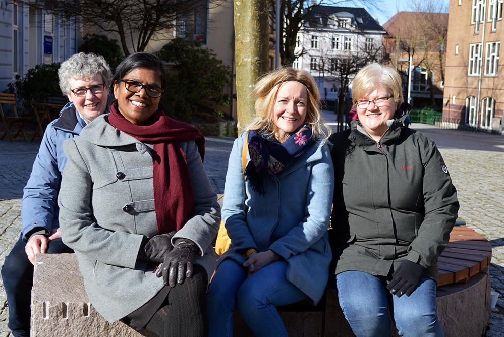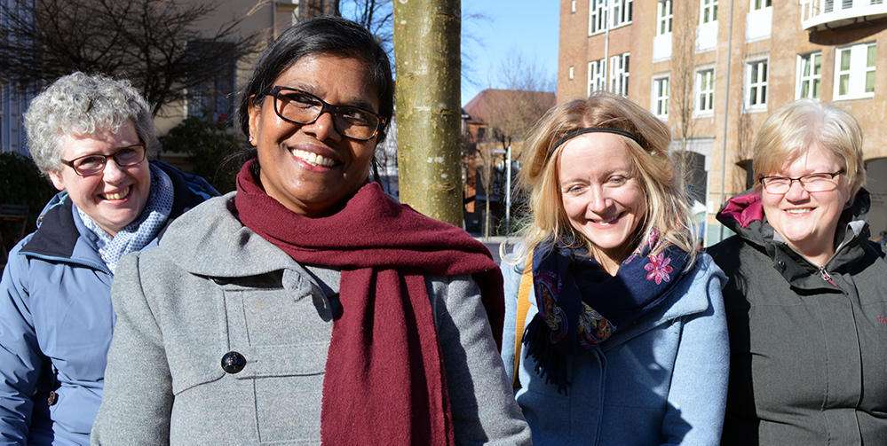 Janne, Hildegun, Jayanthini og Anne Grete er blant deltakerne på kurset SANT660 Flerkulturell forståelse og kommunikasjon. Dette deltidsstudiet i sosialantropologi tilbys første gang våren 2018, og vi tok en prat i vårsolen under den andre helgesamlingen.