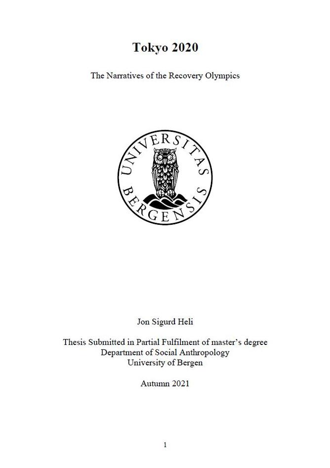 This thesis explores the narratives and discourses related to the Olympic Games in Tokyo. A common theme for the organizers in the 1964 and the 2020 Games is the desire to express a national recovery. As the word recovery reffers to the prcess of improving or healing, the recovery Olympics entails the triumph of large-scale national tradegies. In the 1964 Games, the organizers wanted to demonstrate a recovery of the Tokyo Olympics after the defeat of World War II. The 2020 Games wanted to demonstrate a recovery after the "The Great East Japan Earthquake."