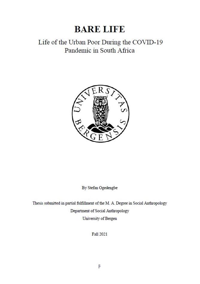 This thesis is an investigation into topics that have been given new contexts and circumstances as a result of the COVID-19 pandemic in South Africa. The thesis focuses on processes of marginalization, enduring inequalities, social abandonment and violence. Ethnographically I focus on the “urban poor”, by which I mean here fisherfolk, domestic workers, homeless and others. I employ a triple analytical focus using the concepts “bare life”, “resilience” and “necropolitics” to highlight the shadow sides of the pandemic response as it has unfolded in South Africa. Throughout the chapters, I argue that the South African pandemic response – which has been among the strictest in the world - have exacerbated inequalities and consequently caused a reduction in quality of life which is especially related hunger, poverty and loss of livelihoods among the urban poor.