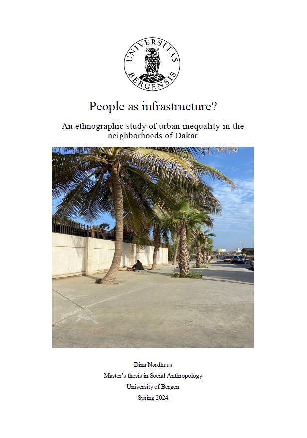 This thesis explores the ways in which security, class and prestige, inequality and forms of housing is structured and lived in times of urbanization and development in urban Dakar. I view these topics in the different scales they are organized and unfold, through felt experiences of the city and, last how they are structured on political and economic levels. Particularly, I seek to explore how modernism, traditionalism and prestige are navigated alongside a long period of globalization and French influence. Further I discuss security through privatization of the city and prestige as a part of the urban inequalities of the city. These topics are intertwined, I argue and relevant to measure and understand the ways in which urban inequality is lived and structured in Dakar. Through the analytical framework of “people as infrastructure”, this thesis explores the extent to which contemporary Dakar can be understood in this manner. Relational connections and networks have been seen as the infrastructure of many African cities, but as my ethnography shows, this is challenged by increased forms of security measurements, privatization and enclaving. Additionally, these elements are used to show prestige and express class differentiation and thus exclusion of marginalized citizens in significant parts of the city. La Corniche Ouest, illustrated on the front page of the thesis, has become both a symbol of a metropolis and embodied upper-class space making visible the urban inequality and spatial segregation. However, the concept of Téranga is still emphasized as an important marker of the sociability, namely hospitality and the idea that you should be helpful and open to your neighbor. I discuss whether this concept, relating to people as infrastructure can maintain within the continuous stream of new people and new forms of housing, transforming the physical infrastructure in some parts of the city and leaving everything up to its residents in less favored areas of a reconfigured urban order.
