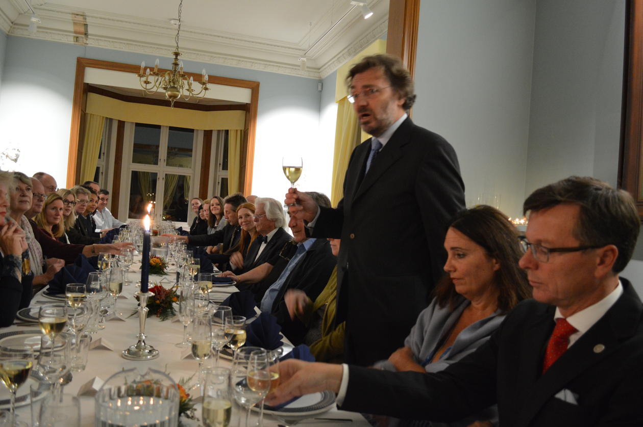 Senere på ettermiddagen ventet den første, og heretter årlige, Fredrik Barth Æresforelesning. Professor Magnus Marsden ved Universitetet i Sussex holdt et spennende foredrag om afghanske handelsnettverk. Innflytelsen fra Fredrik Barth selv, som gjorde sine første betydelige feltarbeid i samme region, var tydelig i Marsdens forelesing. Deretter gikk våre prominente gjester, Magnus Marsden, sosialantropolog og Barths kone, Unni Wikan, instituttledere fra Oslo, Trondheim og Tromsø, rektor ved UiB og dekanen på SV-fakultetet, professores emeriti ved instituttet, og dagens ansatte videre til siste punkt på programmet, festmiddagen. Her ble deilig mat spist med hyggelige bordkavalerer, smigrende taler holdt og morsomme anekdoter fra «gamle dager» fortalt til langt på kveld.
