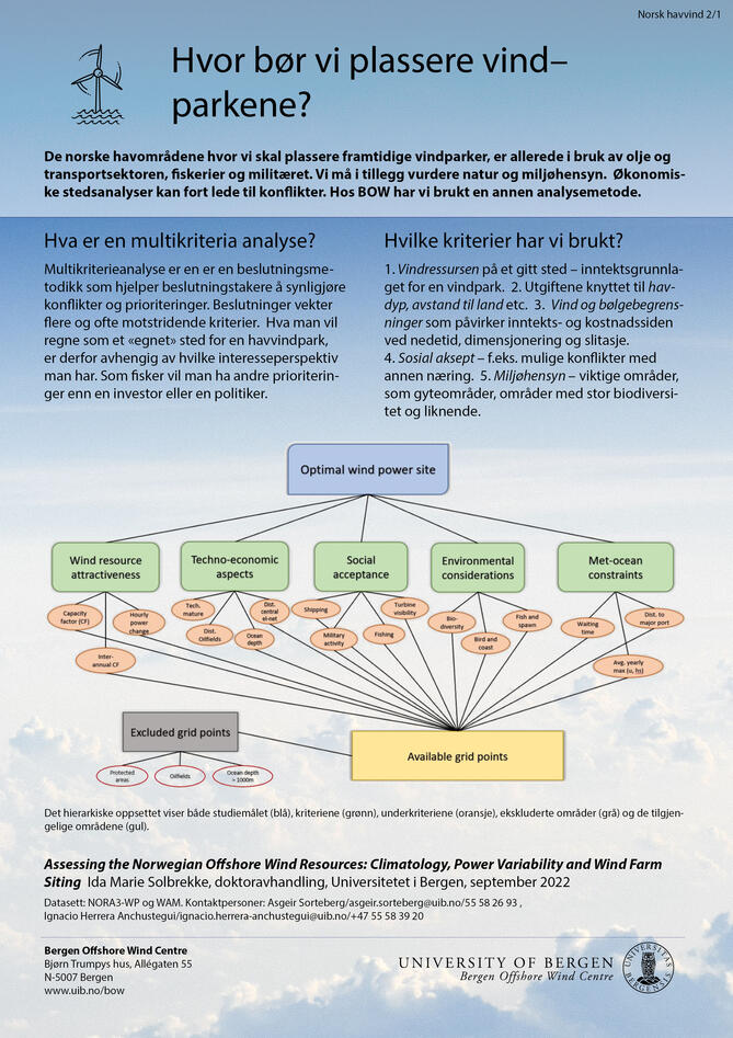 Ida Marie Solbrekke har sammen med Asgeir Sorteberg brukt en metode kalt «analytisk hierarkisk metode (AHP)hvor de har inkludert kriterier innenfor vindressurser, teknoøkonomiske aspekt, sosial aksept, miljøhensyn og maritime begrensninger knyttet til vind- og bølgeforhold.
