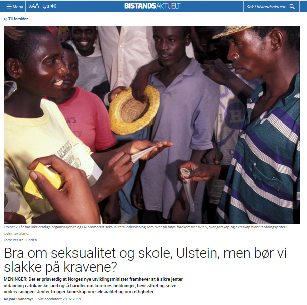 Svanemyr skriver: «Det er bra, men utfordringen er muligens større enn den nye utviklingsministeren aner. Organisasjoner og institusjoner som jobber med å fremme seksualitetsundervisning både i og utenfor skolen, må tenke mer på hvordan de skal få dette på plass i stor skala.
