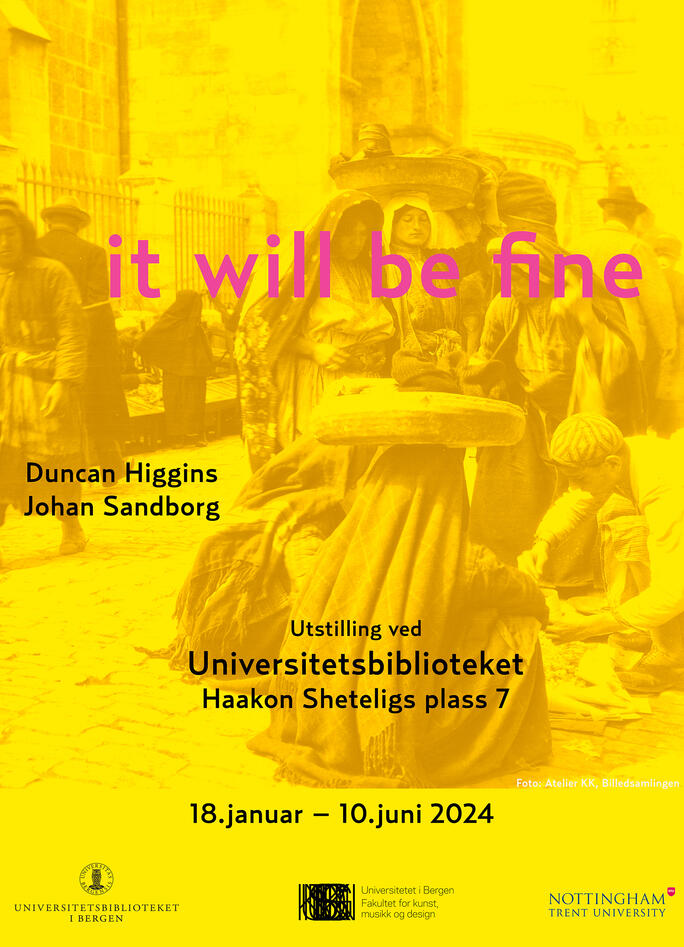 I utstillingen It will be fine av Duncan Higgins og Johan Sandborg presenteres kunstverk som undersøker vår lesning og forståelse av visuell representasjon. Verkene er skapt med utgangspunkt i historiske fotografier (Atelier KKs) fra Billedsamlingen ved Universitetsbiblioteket i Bergen, og bearbeidet ved å kombinere forskjellige kunstneriske medier, metoder og prosesser, deriblant bilderedigeringsprogram.