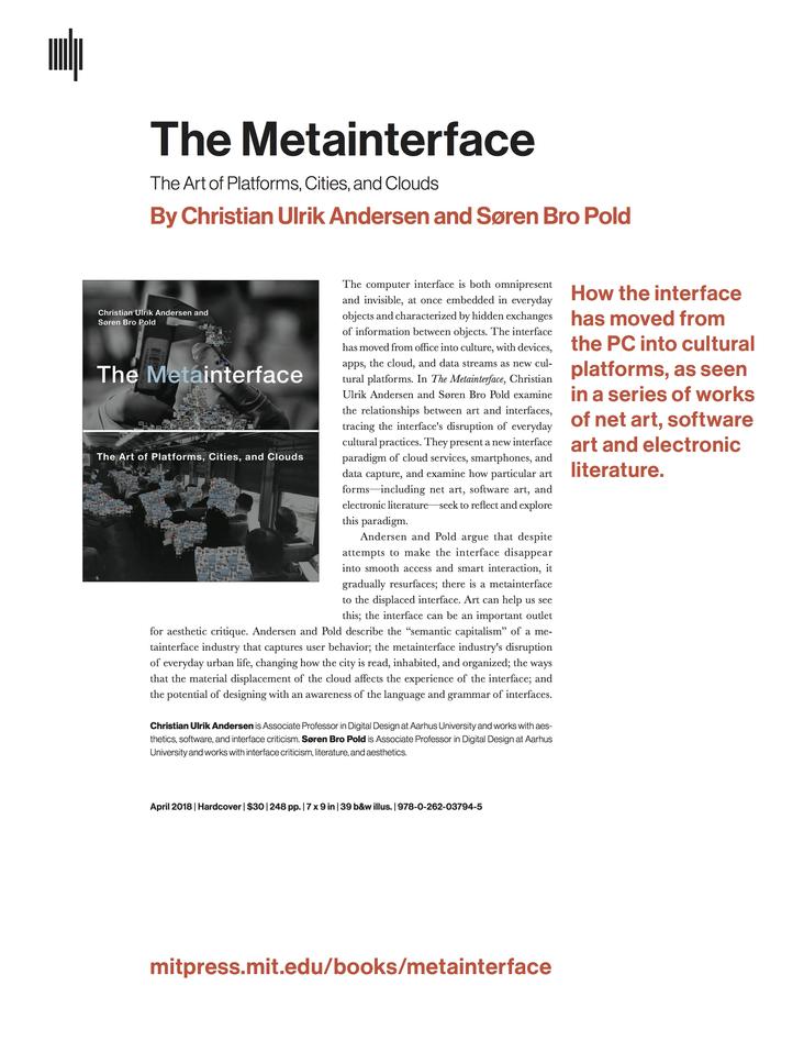 The event will include a guest lecture by Søren Pold, co-author of The Metainterface: The Art of Platforms, Cities, and Clouds (MIT Press, 2018) and short 5-8 minute ‘lightening talks’ from network members.