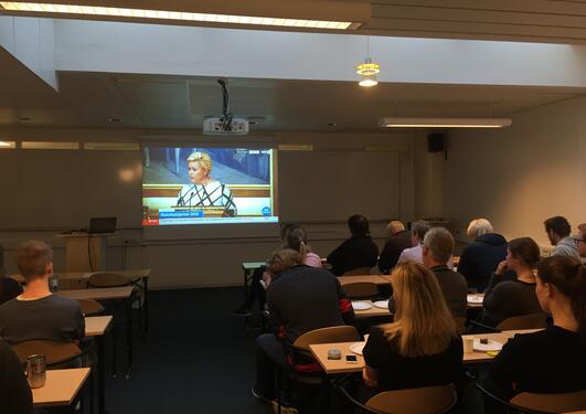 Institutt for økonomi inviterte studentar til statsbudsjettkafè med streaming og analyser av samfunnsøkonomar ved UiB.