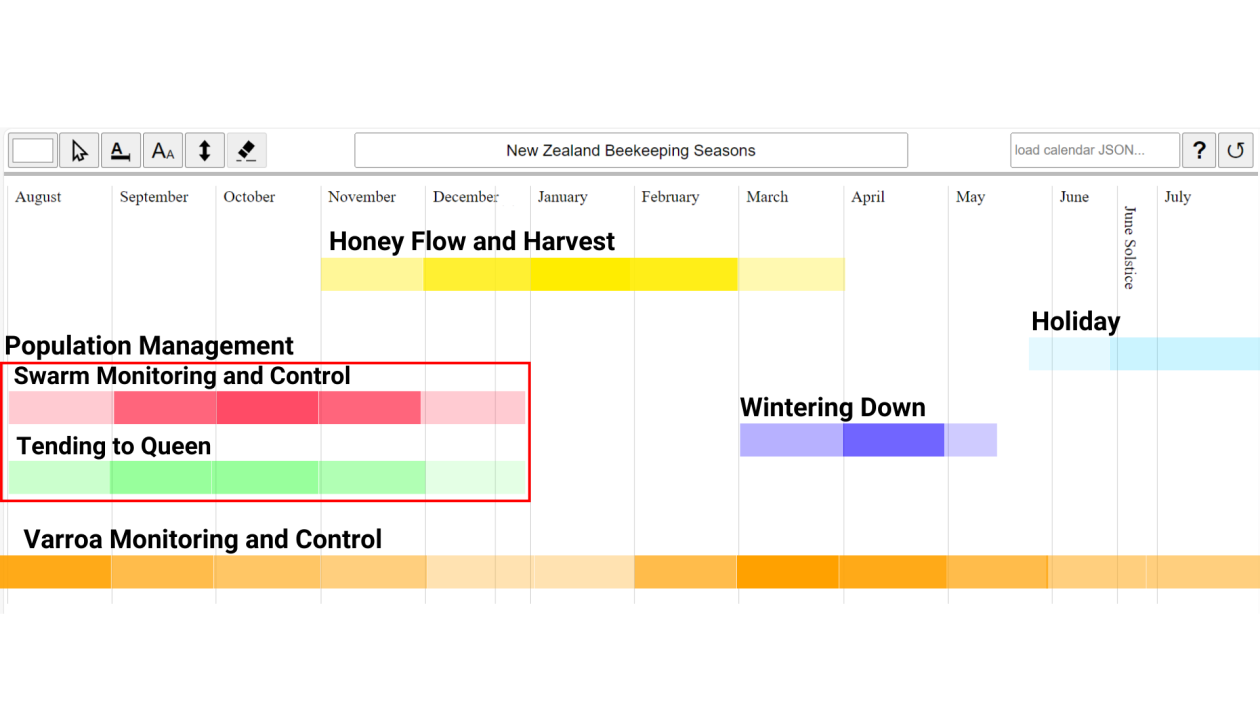 We have discerned roughly four seasons in the calendars of New Zealand beekeepers from 10 hand-drawn calendars, interviews, and calendar tool submissions. The beekeeping year begins in August in New Zealand with population management, followed by honey flow and harvest, wintering down, and ending with a holiday for beekeepers. During population management, beekeepers deal with swarms and tend to the queen honeybee. There are lots of brood in the hive during this time as worker bees are created in preparation for nectar collection.