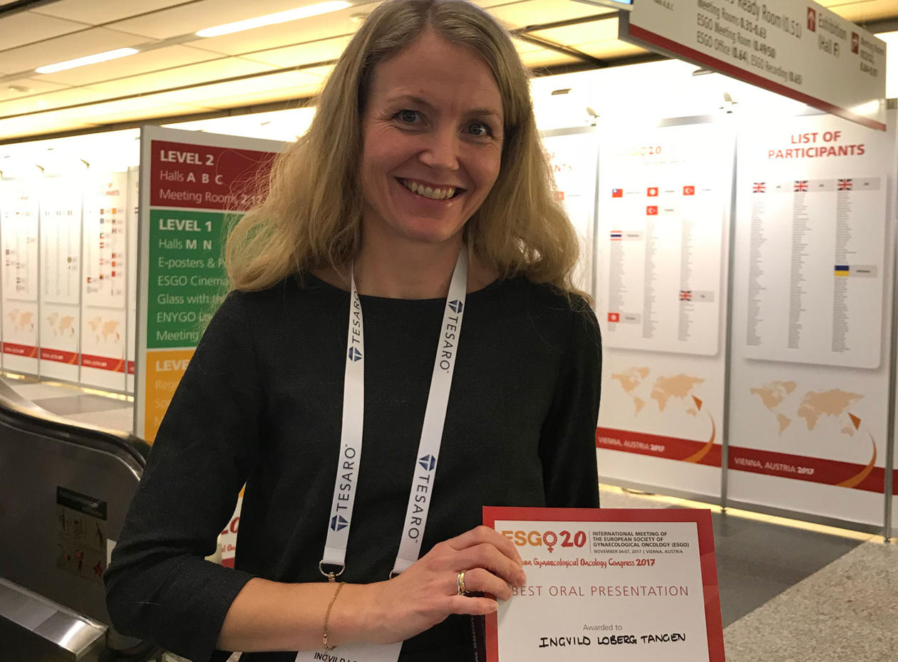 Postdoc in the Bergen Gynecologic Cancer Research Group, Ingvild Løberg Tangen, was awarded with the best oral presentation prize at the ESGO (European Society of Gynaecological Oncology) congress for the presentation : “Expression of L1CAM in curettage or high L1CAM level in preoperative blood samples predicts lymph node metastases and poor outcome in endometrial cancer patients”.