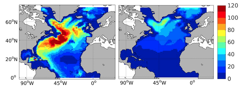 Amount of man-made carbon stored in the deep North Atlantic (in moles C/m2) for a model with a high future carbon uptake capacity (left panel) and a model with a low future carbon uptake capacity (right panel). Figures: N. Goris