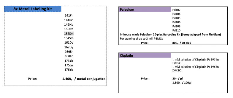 List of suspension antibodies (100 NOK/ul, minimum amount 4ul), metal labeling kits, paladium and cisplatin available.