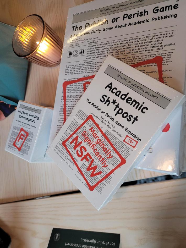 Testimonials: “It was a blast — it pokes fun at a lot of absurdities of academia. A perfect game for a lab party!” | From the webpage: The Publish or Perish Game is a humorous party game about academic publishing. Players race to publish manuscripts with useless nonsense while sabotaging each other's research. Suitable for academics seeking catharsis and families who don’t mind light emotional damage. |
