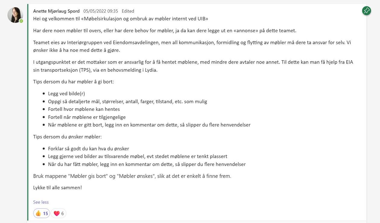 On these pages, you will find a step-by-step guide on how to procure furniture for your unit. The University of Bergen is committed to sustainability and encourages the reuse of furniture whenever possible. Before purchasing new items, please check whether there are used furniture available that meets your unit’s needs.