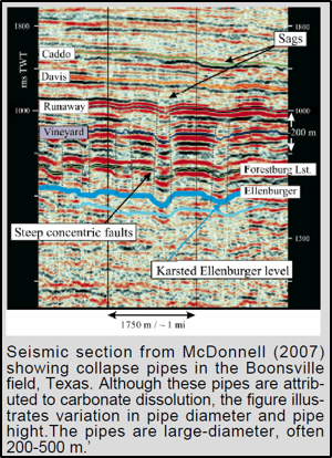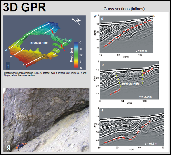 The available reference data set come from the Wordiekammen plateau in the Carboniferous Billefjorden half-graben basin on Spitsbergen, where cliffs bounding the plateau expose breccia pipes. On the plateau top, the collapse pipes are obscured by thick scree, thus km- scale size and spacing data for the pipes and faults were collected in 2011 by mapping the bedrock with 2D GPR. Two pipes were further studied in 3D using high-resolution GPR, seismic tomography and electrical methods. These geophysical data were merged into a comprehensive 3D framework including helicopter-borne lidar and photo scans of the plateau rim geology, thus allowing an integrated visualization and interpretation of the different datasets. Breccia bodies were then identified by steep-sided zones of complex diffraction patterns interrupting bedding-related continuous reflections. Such structures will then be modelled by the convolution modelling mentioned earlier as an application test.