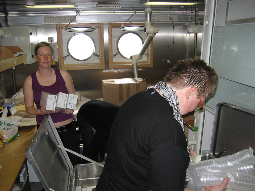His equipment will fill up much of the two geochemistry labs. In the remaining space Tamara will set out what she needs to test the geochemical properties of the various waters: vent water, plume water and water from the sediment cores. Tamara is a PhD student from Swiss Federal Institute of Technology (essentially the Swiss MIT). She is half-way through her PhD and this is her third summer cruise aboard the G.O.Sars. Tamara's results will tell us information about what the seafloor looks like in this area. It is already showing that there are layers of sediments covered by volcanic layers. Such information is critical to a systemic understanding of the geobiology of this area. (Read the interview about Tamara from 2008)