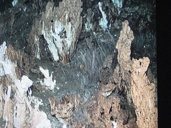 As we began to explore the area we stumbled on a field of unusual mini tower structures. Some were covered in thick foamy mats of white bacteria. It is a phenomena that even our most experienced vent expert, Marvin, has never seen before. We harvested a couple of the mini towers with our sampling drawer to bring to the surface. What can they be? How are they formed? What are they made of?