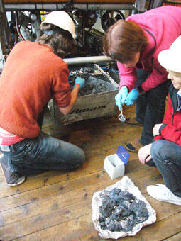 There were many sampling attempts today. There were several box cores for the macrobiologists, but unfortunately they were empty. The gravity corer brought up a short sample of 30-40cm in length. Both indicate that the sediment coating here is not very deep, suggesting that the sea-floor here is relatively young. The microbiologists are filtering some of the water samples for potential microbial organisms.