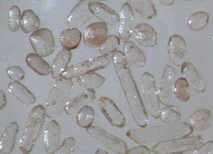 Upper : grains of detrital zircon extracted from a sedimentary rock. The elongate grain in the centre of the photograph is ca. 0.2 mm long. Lower : laser ablation tracks in 20 Ma old monazite grain enclosed in feldspar, Barun gneiss, eastern Nepal.