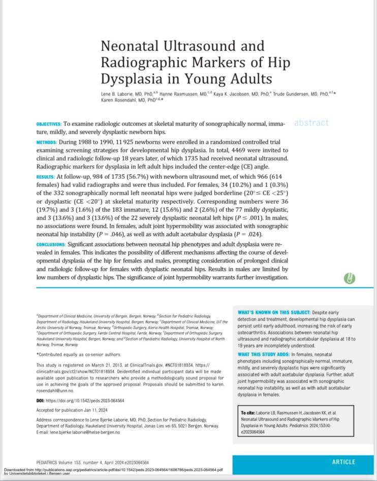 Our multidisciplinary HIPS research group in Norway aims to contribute to a better understanding of the complex mechanisms involved. We are excited to share our latest findings from the large, longitudinal population-based hip cohort, newly published in Pediatrics.