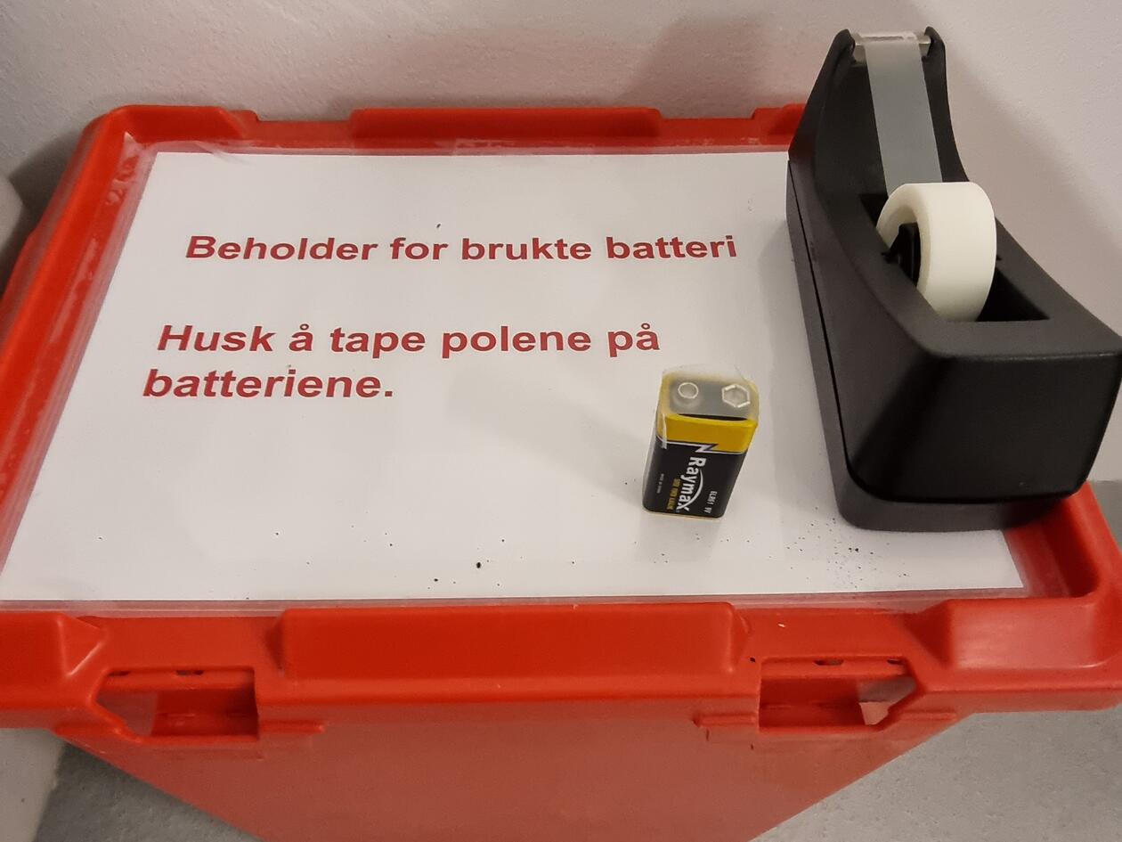 Single-use batteries must be put in red waste disposal boxes when they are spent. All units at UiB have at least one box available in their premesis. The image below shows what these boxes look like. Remember to put tape on the battery poles of 9-volt batteries (the battery type in the photo).