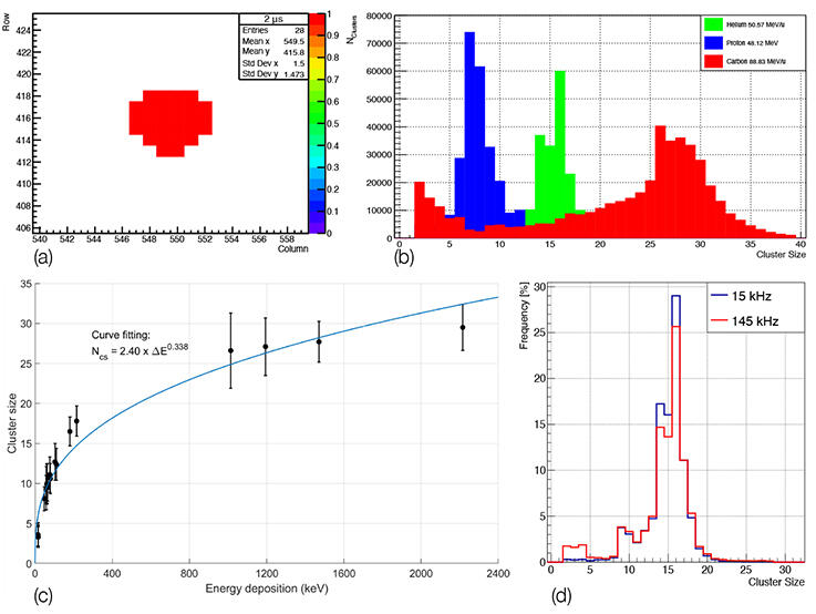 Figure 3: Example of a cluster detected by the ALICE pixel detector (ALPIDE) chip from an 241Am source after 2 μs. Frame period 1 MHz, Frame Duration750 ns. (b) Proton, helium, and carbon ion cluster distributions at the minimum energies available at HIT. (c) A plot of the cluster size as a function of the energy deposition in the epitaxial layer of the ALPIDE chip. The energy deposition was evaluated through MC simulation, the cluster sizes are experimental point taken during the two experiments at the HIT facility. (d) Cluster distribution in a single ALPIDE chip in both high (15 kHz) and low (145 kHz) occupancy environments. Figure published in Alme J, et al., Frontiers in Physics. 2020;8(460); © 2020 Alme, et al. Creative Commons Attribution License (CC BY).