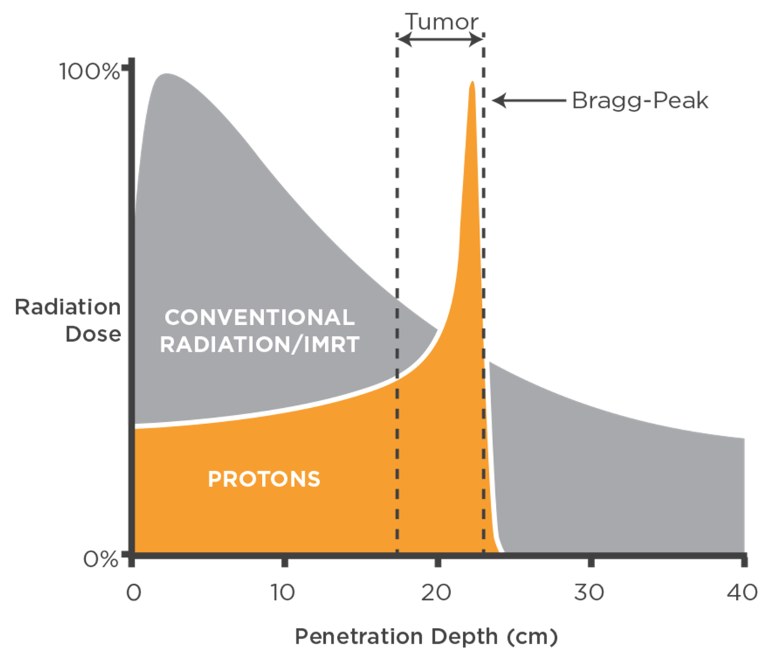 Figure 1: Comparison of the dose deposition for conventional X-rays radiotherapy and proton therapy. The dose deposit for protons is focused at a certain depth, in contrast with X-rays which deliver dose all along their path.