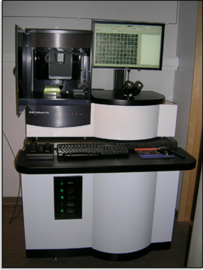 The BD Pathway 855 (2006-model) is a fully automated microscope that provides the option of automated image acquisition and data analysis on multi-well plates (96 and 384).