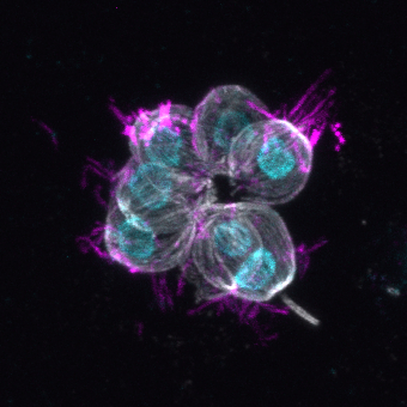 Choanoflagellate colony showing DNA in cyan, microtubules in grey and actin in magenta.