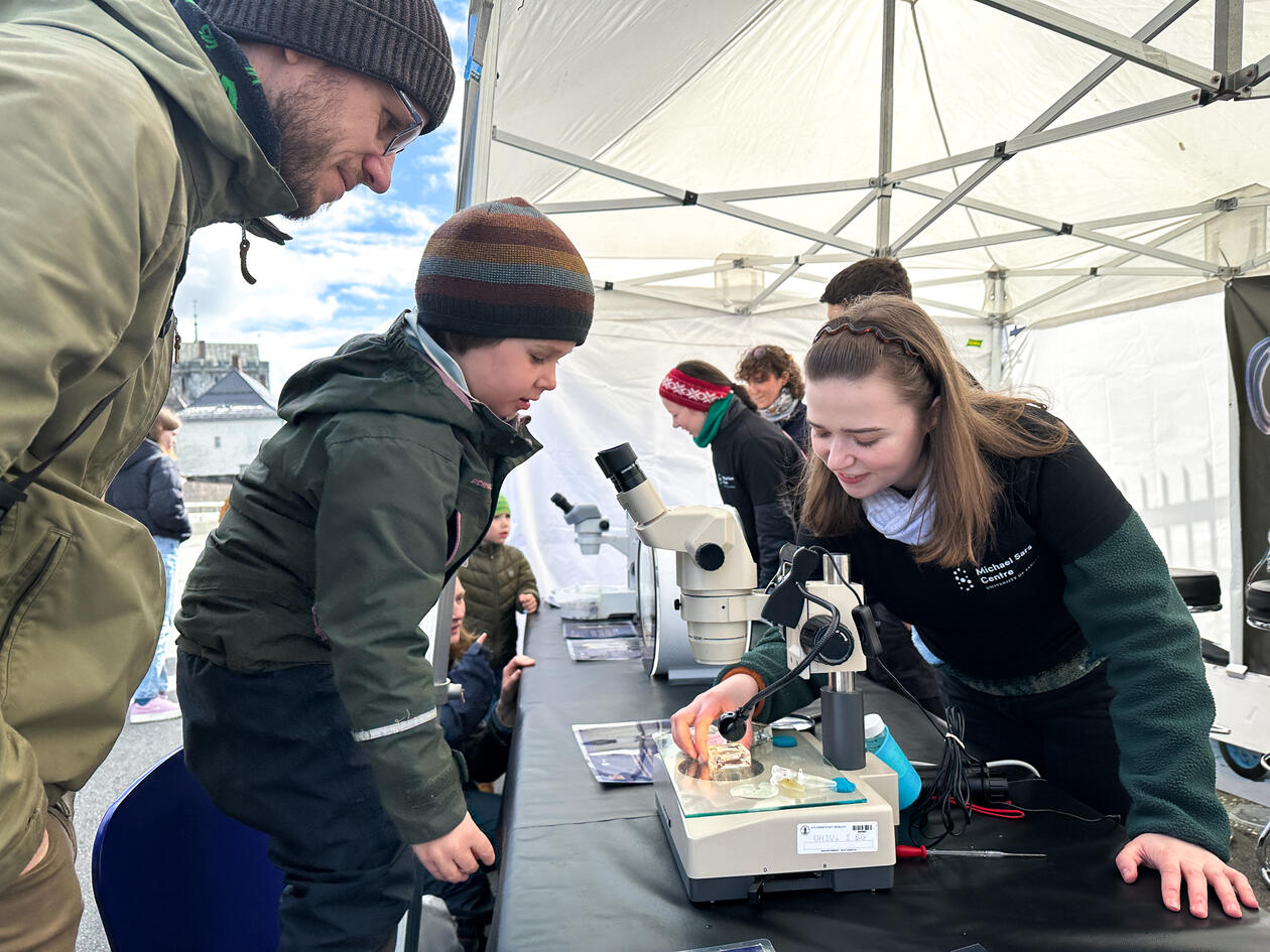 Sandra Kyrkjebø shows Oikopleura under the microscope to a young visitor.
