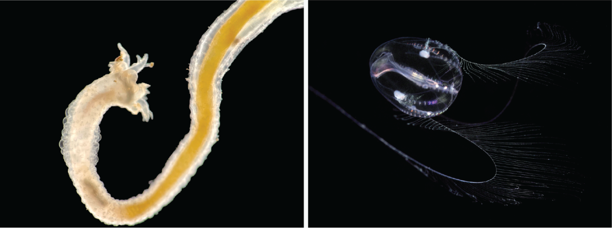 During her project, Emily hopes to establish the sea cucumber Labidoplax buskii in the laboratory (left). Ruth will work with the ctenophore Mnemiopsis Leidyi, here depicted at the larval stage.