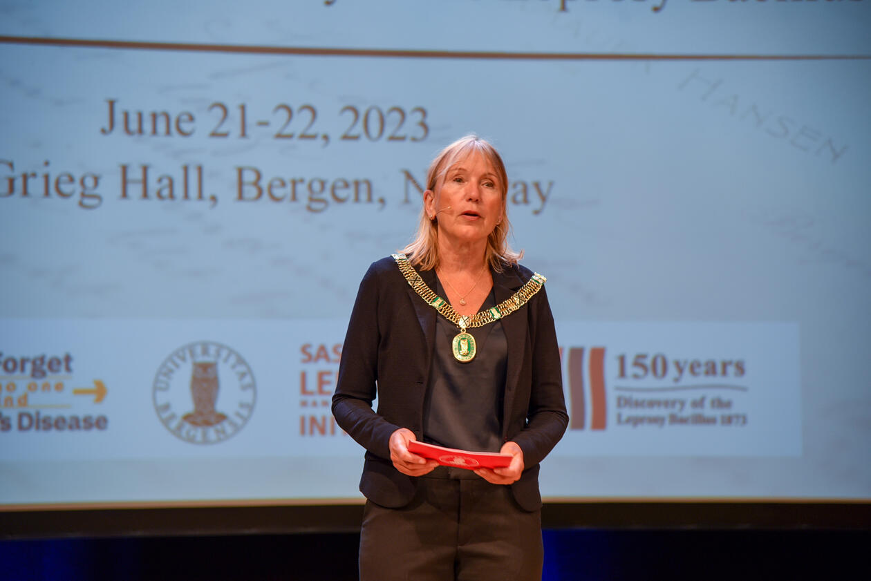 Rector at UiB Margareth Hagen and Minister of Health Ingvild Kjerkol were among several introducers when The 2023 Hansen Anniversary opened. Over 30 nations are represented at the commemoration.