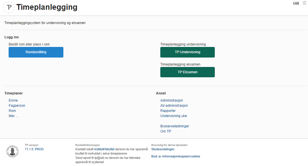 Ansvar: Timeplanene til hvert enkelt undervisningsemne eies av hvert enkelt fakultet/institutt. Det er instituttene lokalt som har ansvar for at timeplanene er så korrekte som mulig. Studieadministrativ avdeling (SA) har ansvar for timeplanleggingsverktøyet, som ved UiB heter TP.