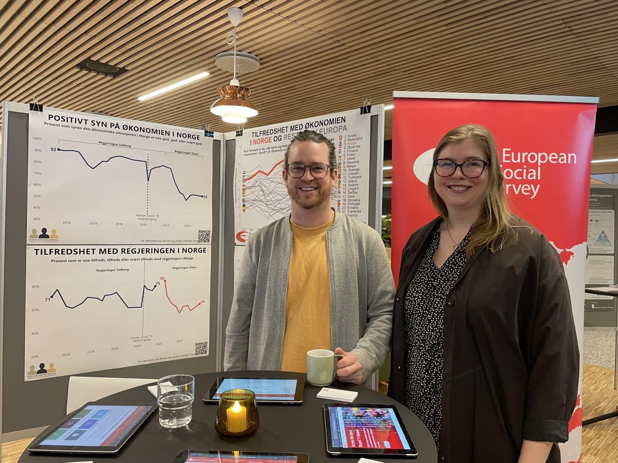 ESS Norges nasjonale koordinator, professor II Sveinung Arnesen ved Institutt for politikk og forvaltning, og Førsteamanuensis Åsta Dyrnes Nordø ved samme institutt, har hatt flere spennende samtaler på standen.