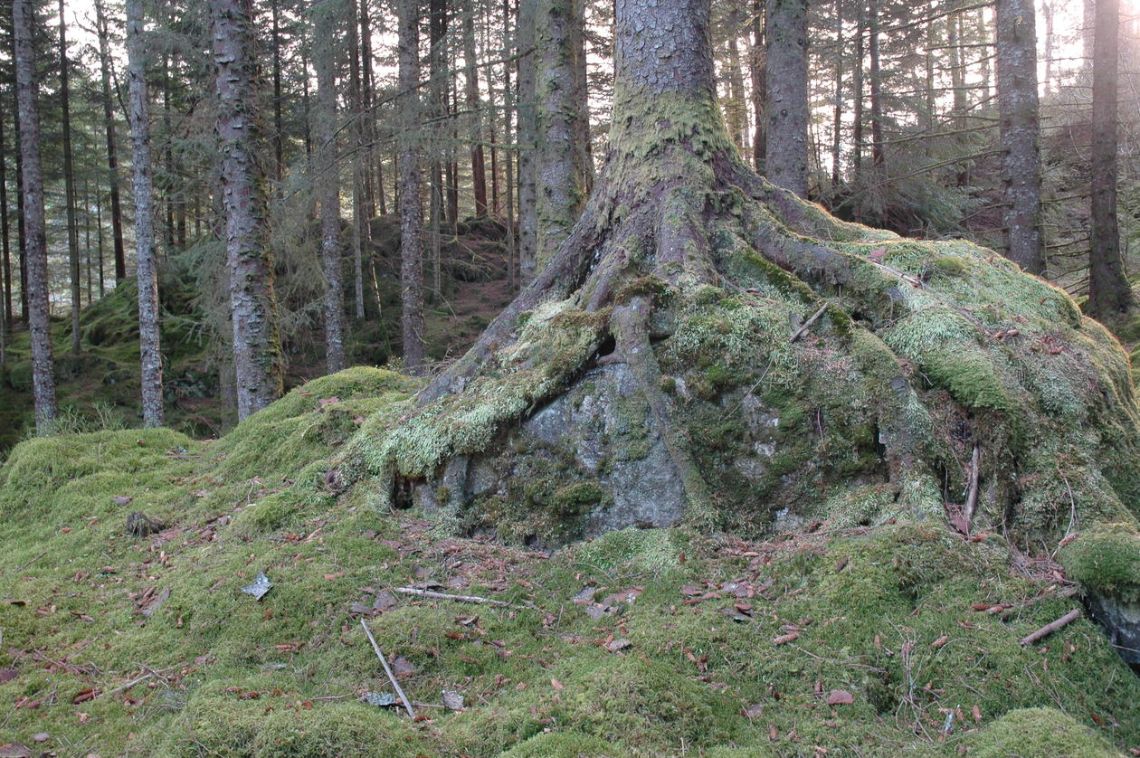 Vår eldste teig av sitkagran ved Mørkevågen er no så lysopen at det veks eit fint grønt teppe av mose i skogbotnen. Grana på biletet er spesielt artig fordi ho har tatt eit godt grep om ein svær kampestein.
