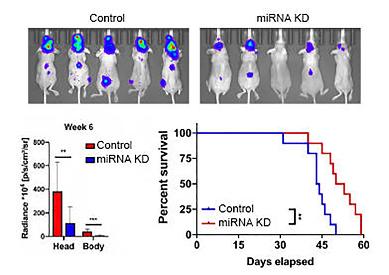 Human MBM cells where a specific miRNA is knocked down, develops significantly fewer brain metastasis in nude mouse brains, compared to the control MBM cells (upper panel). The lower panel shows quantification of tumour burden from bioluminescent images, and animal survival (** p < 0.01, *** p < 0.001)