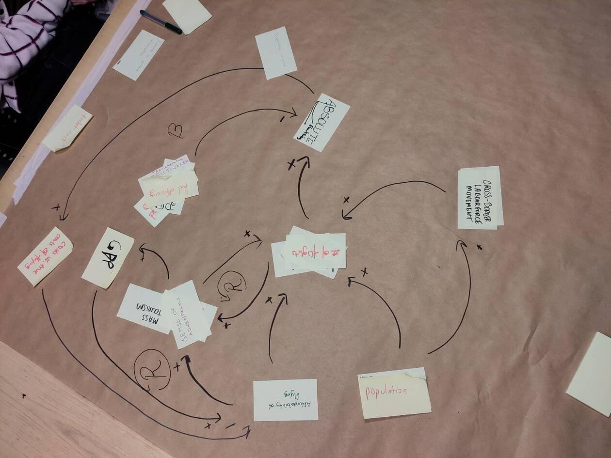 To put this in more perspective, the first issue that this group is currently discussing is the impact of emissions from the aviation industry. With it being one of the most unequally polluting industries, a post-growth perspective looks to find ways to mitigate air travel through human behavioral change. Our group uses System Dynamics to model and identify drivers for this behavior. We are currently building a Causal Loop Diagram (CLD) to help us visualize how and why people choose to fly and the consequences of that. This is taking the course over multiple sessions, but it has already become an exciting combination of theory and methodology. It has provided valuable insight into how System Dynamics can be used.