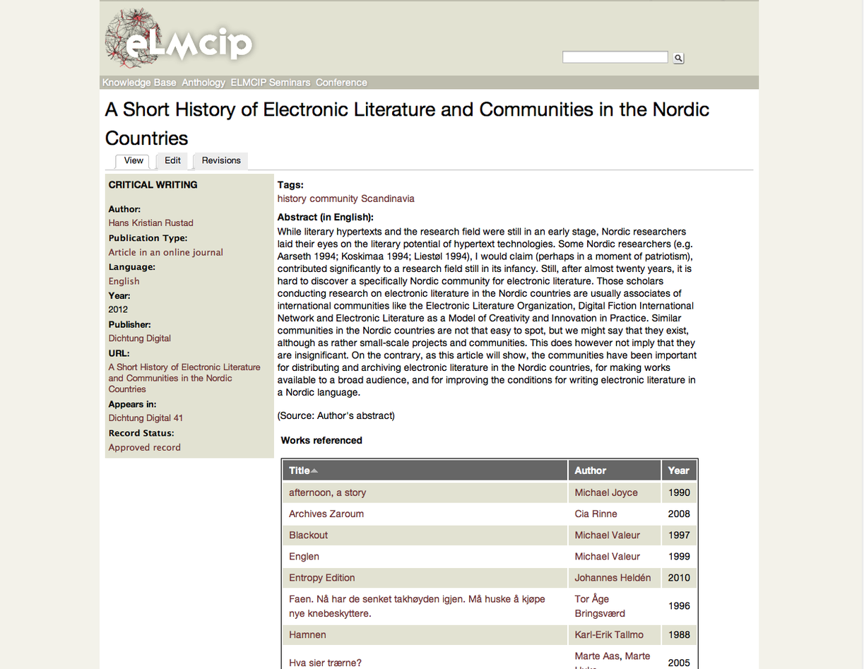I want to share this entry as an example of "Going deep" on cross-referencing in the Knowledge Base. The entry for Rustads's Dichtung Digital 41 article on Nordic Electronic Literature is now one of the best examples of a "complete" record, not only including full text of the article and video of the conference presentation that preceded it, but a great deal of very useful cross-reference information. We brought in documentation of all of the Nordic e-lit works and the majority of the other criticism referenced in the article. The more of this type of extensive cross-referencing we can do in the KB, the more useful it becomes in establishing the relations between creative and critical practice in the field.