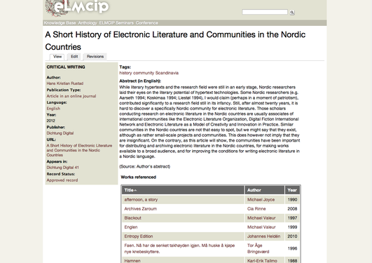 The cross-references in the ELMCIP Knowledge Base are what really make it valuable. Here is an exemplary entry, with extensive references to works discussed and further documentation.