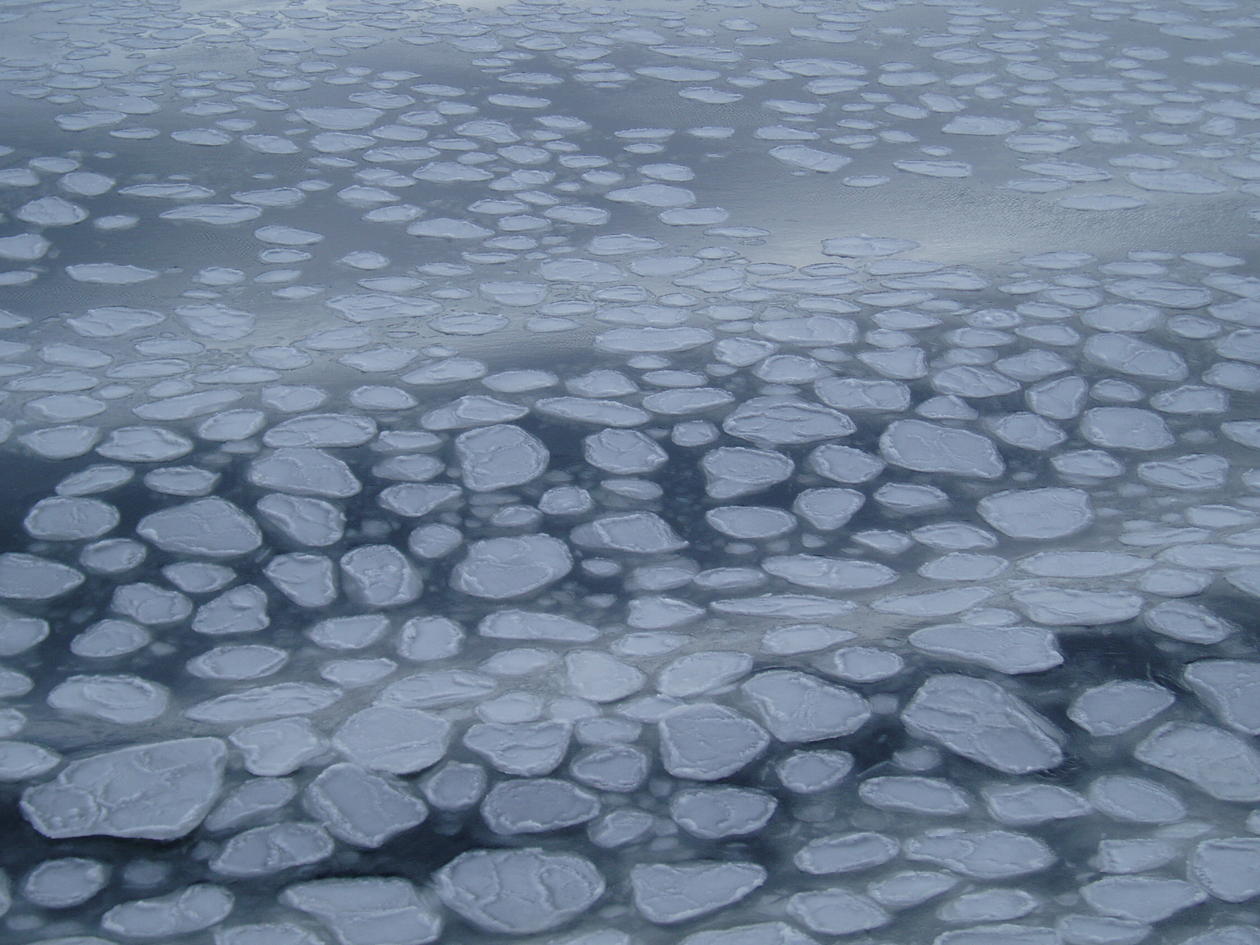 In Antarctic waters (image) much of the sea ice forms under influence of waves, and pancake ice is formed. The pancakes form due to the waves bouncing the small floes against each other during sea ice formation. With time the pancakes grow thicker and larger, and the waves dampen out. Another form of sea ice is the initial loose crystals termed frazil ice. This is individual crystals suspended in water, and they stay suspended below the surface due to vertical mixing.
