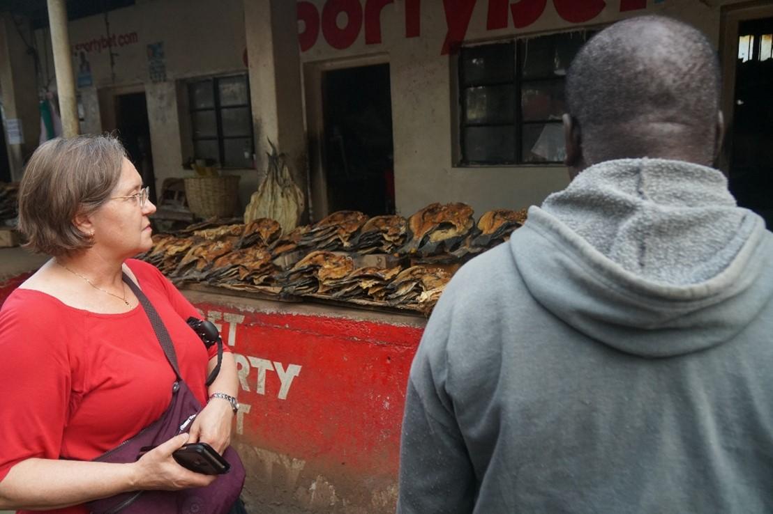 Ragnhild Overå probes a local market vendor as she examines dried, fried, and smoked fish at a local market in Kisumu.