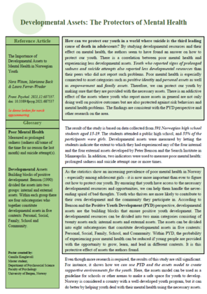 The result of the study is based on data collected from 591 Norwegian high school students aged 15-19. The students attended a public high school, and 55% of the participants were girls. Developmental assets were measured by letting the students indicate the extent to which they had experienced any of the four internal and the four external assets developed by Peter Benson and the Search Institute in Minneapolis. In addition, two indicators were used to measure poor mental health: prolonged sadness and suicide attempt one or more times.