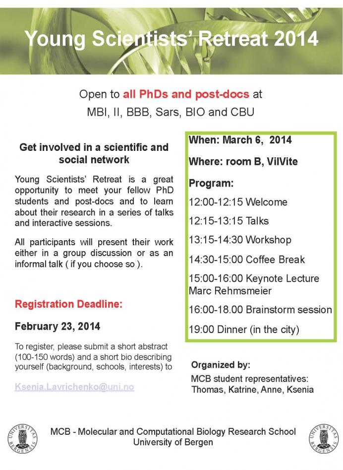 We are happy to re-announce this year's Young Scientists' Retreat, which will be Thursday March 6, 2014.