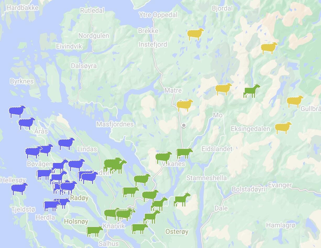 Survey sites for assessing biodiversity and ecosystem services delivery under different grazing managements. Sites are represented by the relevant grazing animal (cow, sheep or goat) and the colours reflect the ecological zonations used in this study: Coastal (blue), fjord (green) and mountain (yellow) areas.