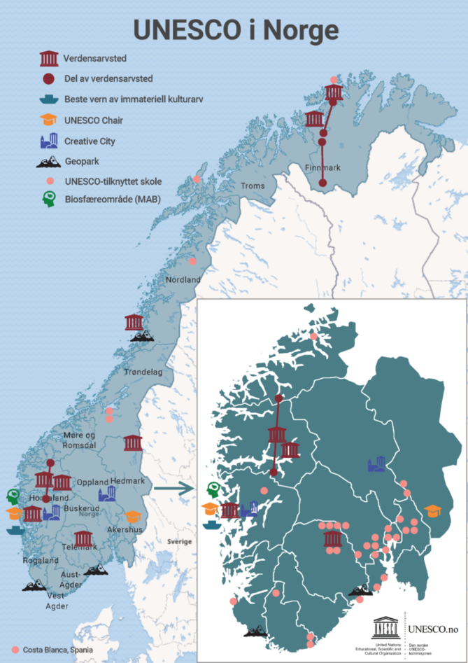 Several ministries are involved in the UNESCO work in Norway. The Ministry of Foreign Affairs has the overall responsibility for Norwegian policy at the UN, including UNESCO. The Ministry of Education and Research is responsible for coordinating Norwegian UNESCO work, and is also responsible for the fields of education and science. The Ministry of Climate and the Environment is responsible for the World Heritage follow-up, while the Ministry of Culture has the responsibility for UNESCO's culture and communication program. While the ministries are responsible for Norway's official UNESCO policy, the Norwegian UNESCO Commission acts as a liaison between civil society and the Norwegian authorities. The Ministry of Education and Research has secretarial responsibility for the Norwegian UNESCO Commission. There are several UNESCO-initiatives in Vestland County. Here is an overview.