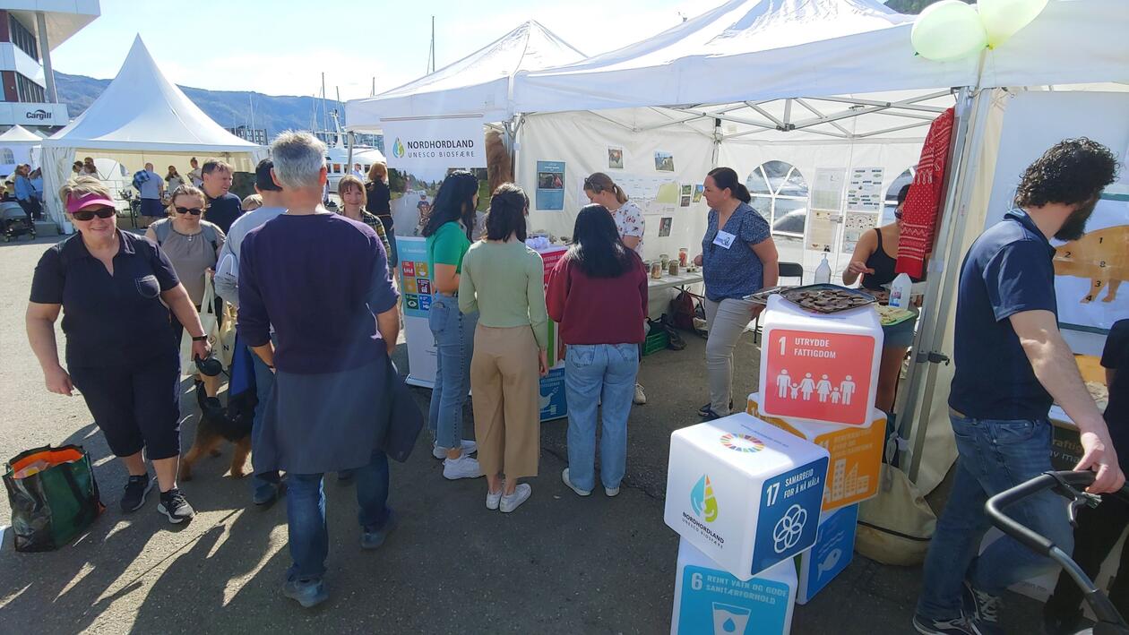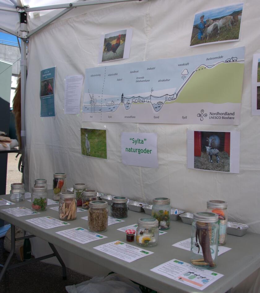 We had set up a stand displaying our research in the Nordhordland Biosphere Reserve area, with special attention to the importance of nature values. Some of the most characteristic nature values of Nordhordland were displayed in the classic "norgesglass" (glass jars), with info cards connecting them to the different UN sustainable development goals. Some of the nature values displayed were for instance agricultural products, clean air and water, wild foods, recreation and biodiversity.