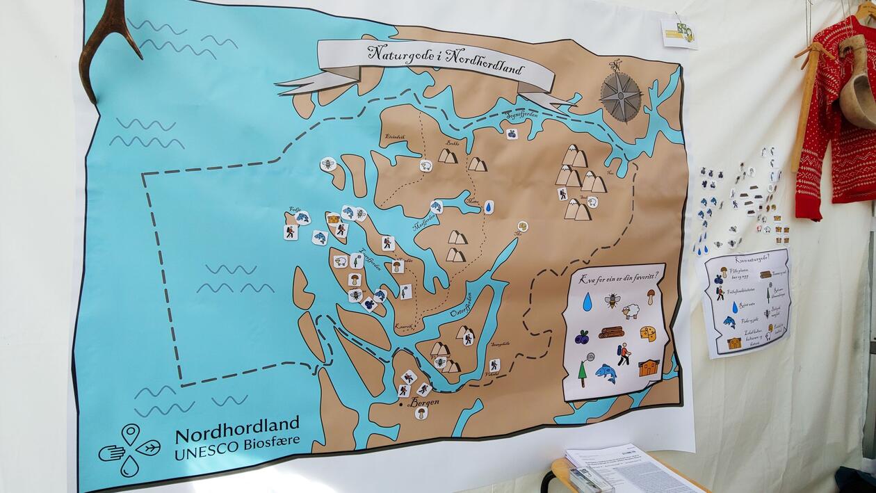 We also conducted a "live" version of PhD candidate Jarrod Cusens participatory mapping of nature values - allowing people to connect different nature values to different places in Nordhordland on a big map. Hiking, fishing, and foraging wild foods seemed to be the most appreciated nature values amongst our visitors this day.
